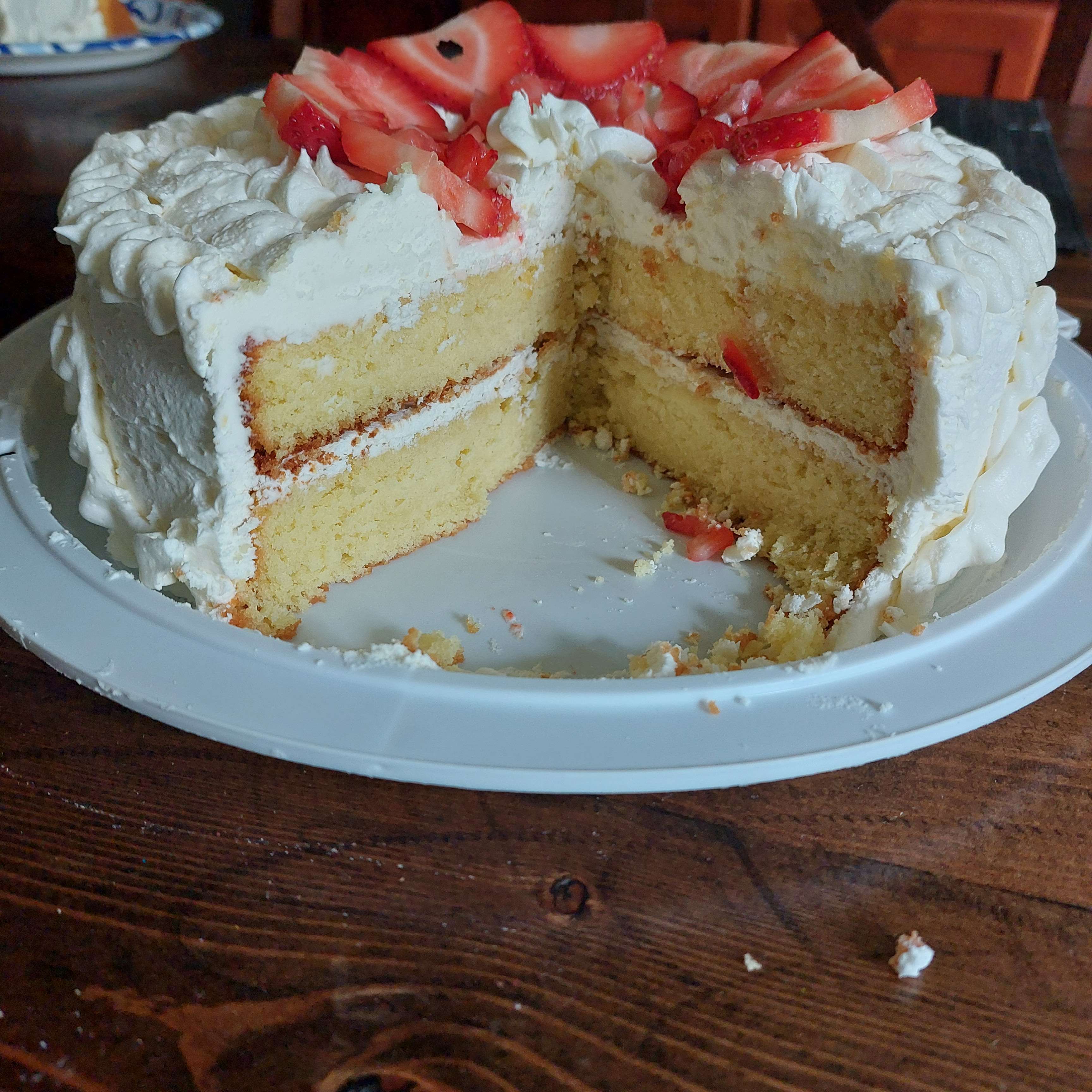 Can you beleive it guys, cakes just a week away. wow! Cakes! Just a week away! Anywas This one is a strawberry lemon cake lol. Lemon ake with a lemon buttercream frosting and fresh straberries on top. Yummy very good very yum yum.