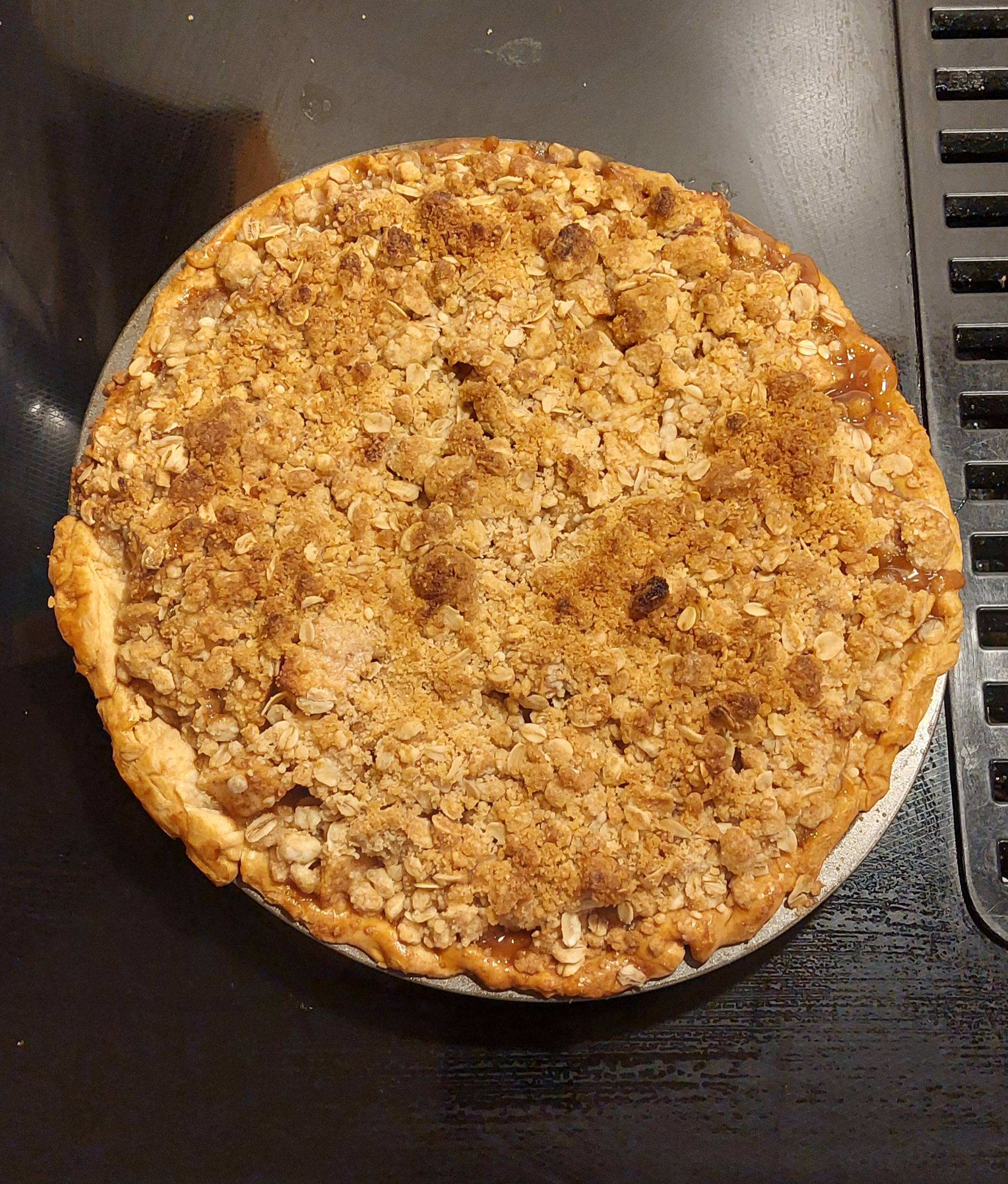 Try our pies, try them, try them, try them, try them, try them anyway this is a apple crumble pie and, gooey apple center with a sweet buttery struessal on top. These pies re probably our most normal item ever. We do various fruit and non fruit pies. We do not put anything into pies, if you are looking for something like that, please see out other goodies section.